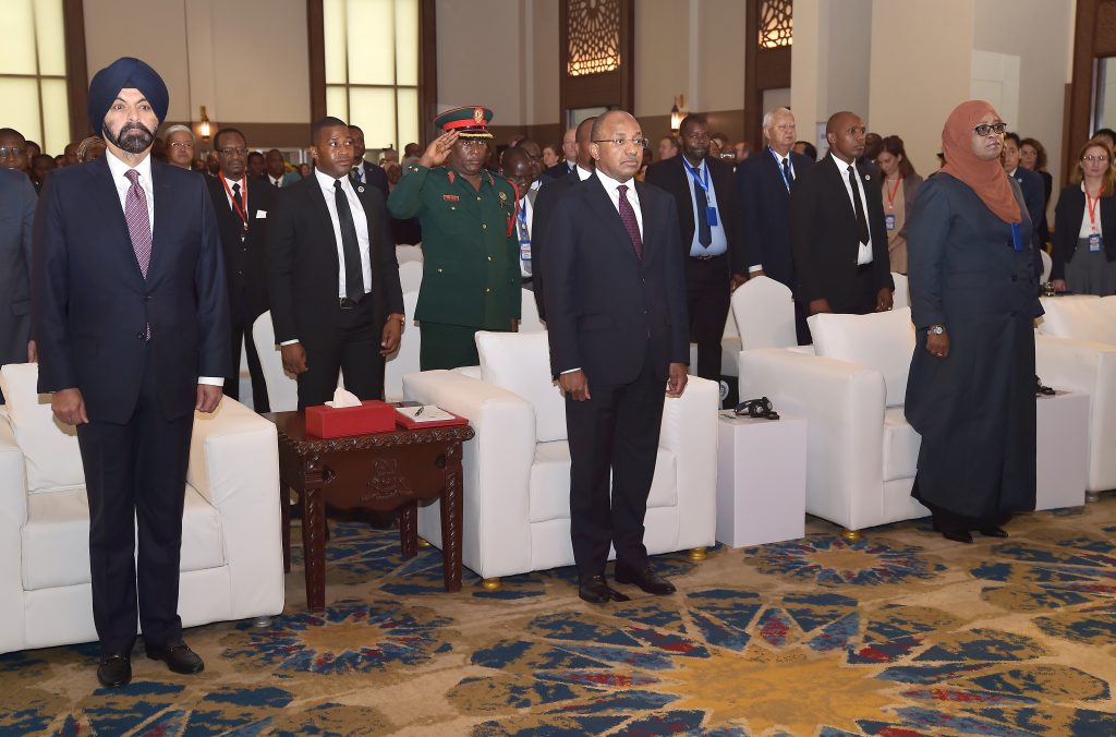 RAIS wa Zanzibar na Mwenyekiti wa Baraza la Mapinduzi Mhe.Dk.Hussein Ali Mwinyi akiwa katika ukumbi wa mkutano wa Golden Tulip Uwanja wa Ndege Kiembesamaki Jijini Zanzibar wakati ukipigwa wimbo wa Taifa na wa Afrika Mashariki kabla ya kuaza kwa ufunguzi wa Mkutano wa Kimataifa wa Tathimini ya Muda ,Wakati wa Mzunguko wa 20 wa Mapitio ya Benki ya Dunia (IDA 20) na (kulia kwa Rais) Rais wa Benki ya Dunia Mhe. Ajay Banga na (kushoto kwa Rais) Waziri wa Nchi Ofisi ya Rais Fedha na Mipango Zanzibar Mhe.Dkt. Saada Mkuya Salum.