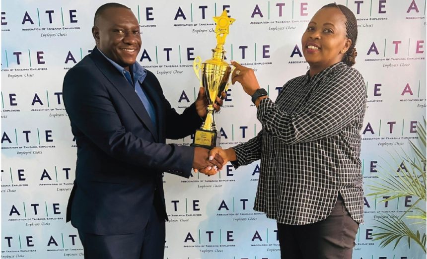 Mkuu wa Idara ya Uanachama na Masoko kutoka Chama cha Waajiri Tanzania (ATE) Bi. Patricia Chao akimkabidhi Afisa Rasilimali Watu Mkuu wa Bohari ya Dawa (MSD) Bw.Adora Duwe kombe la MSD kuwa mshindi wa pili kundi la Mwajiri Bora wa mwaka 2023