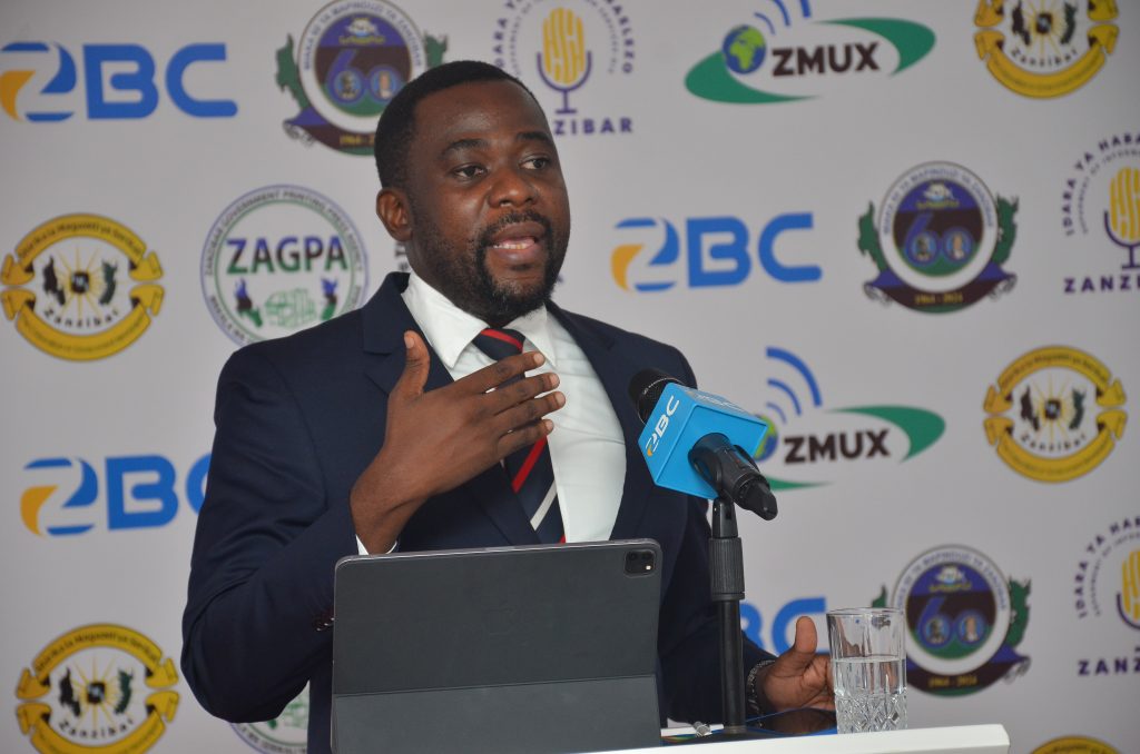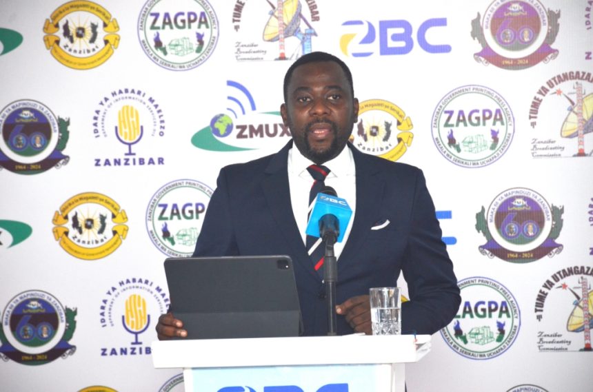 Waziri wa Nchi Ofisi ya Rais Kazi Uchumi na Uwekezaji Mudrik Ramadhan Soraga akizungumza na Waandishi wa Habari kuhusiana na Mafanikio ya Wizara yake kuelekea Miaka sitini ya Mapinduzi ya Zanzibar hafla iliofanyika katika ukumbi wa ZBC Karume House Mnazi mmoja Zanzibar.