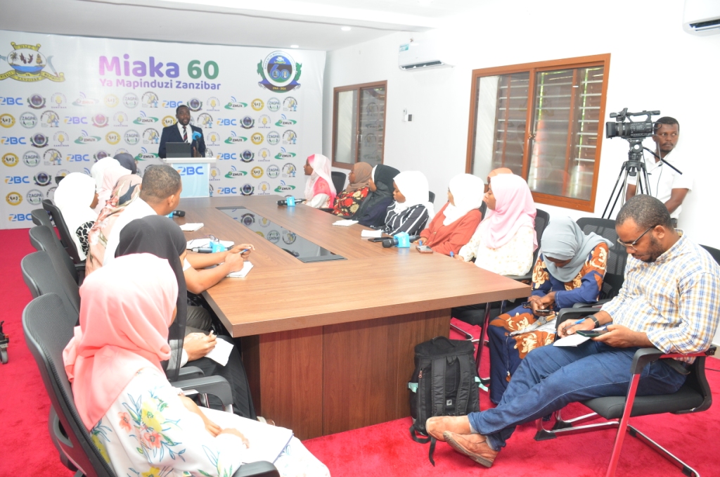 Baadhi ya Waandishi wa Habari wakimsikiliza Waziri wa Nchi Ofisi ya Rais Kazi Uchumi na Uwekezaji Mudrik Soraga wakati akizungumza kuhusiana na Mafanikio ya Wizara yake kuelekea Miaka sitini ya Mapinduzi ya Zanzibar hafla iliofanyika katika ukumbi wa ZBC Karume House Mnazi mmoja Zanzibar.