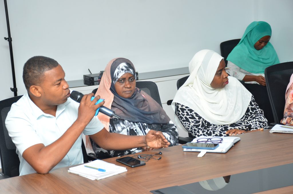 Muandishi wa Habari wa Idara Habari Maelezo Sheha Haji Sheha akiuliza maswali katika Mkutano wa Waziri wa Nchi Ofisi ya Rais Kazi Uchumi na Uwekezaji Mudrik Ramadhan Soraga wakati alipozungumza na Waandishi wa Habari kuhusiana na Mafanikio ya Wizara yake kuelekea Miaka sitini ya Mapinduzi ya Zanzibar hafla iliofanyika katika ukumbi wa ZBC Karume House Mnazi mmoja Zanzibar.