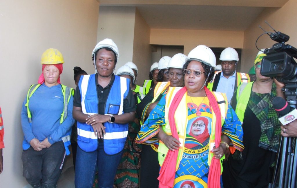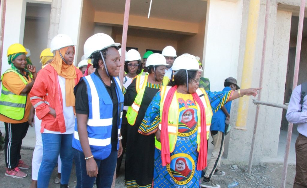 Mbunge wa Viti Maalum(CCM) Mkoa wa Dar es Salaam Mh.Janeth Masaburi akipata maelezo ya Mradi wa Samia Housing Scheme kutoka kwa mhandisi wa mradi huo Grace Musita alipofanya ziara ya kukagua maendeleo ya ujenzi huo Disemba.