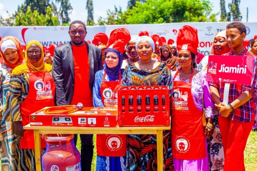 Ummy Mwalimu, Minister of Health and Member of Parliament for Tanga Constituency, ( second right) and Coca- Cola Kwanza Ltd Managing Director Unguu Sulay (second left) pictured with a section of Tanga based food vendors commonly known Mama Ntilie after handing over working tools which included 15kg gas cylinder, two-plate gas cookers, aprons, crate of soda and t-shirts as part of an economic inclusion campaign called Mwanamke Shujaa (A brave woman). (Photo courtesy of Coca-Cola Kwanza Ltd).