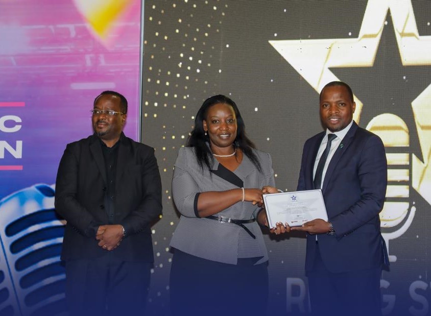 Katibu Mkuu Wizara ya Utamaduni, Sanaa na Michezo Gerson Msigwa (kulia) akikabidhi cheti kwa mwakilishi wa benki ya Letshego Faidika Selestino Nachenga (wa pili kushoto) mara baada ya fainali za mashindano ya muziki wa mtandaoni (Rising Star Online Music Competition) yalifanyika kwenye ukumbi wa Msasani Tower. Wa kwanza kushoto ni Afisa Mtendaji Mkuu wa kampuni ya Radian Limited, Freddie Manento.