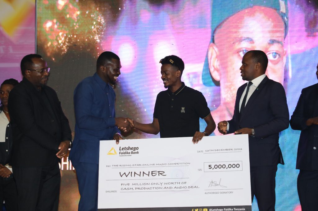 Mwakilishi kutoka benki ya Letshego Faidika, Selestino Nachenga (wa pili kushoto) akikabidhi mfano wa hundi yenye thamani ya Sh milioni 5 kwa mshindi wa kwanza wa mashindano ya muziki wa mtandaoni (Rising Star Online Music Competition) msanii Sailas Mwakabana “Boy Cylla” (wa pili kulia). Mashindano hayo yalifanyika kwenye ukumbi wa Msasani Tower jijini Dar es Salaam. Wa kwanza kushoto ni Afisa Mtendaji Mkuu wa kampuni ya Radian Limited, Freddie Manento wakati wa kwanza kulia ni Katibu Mkuu Wizara ya Utamaduni, Sanaa na Michezo Gerson Msigwa.