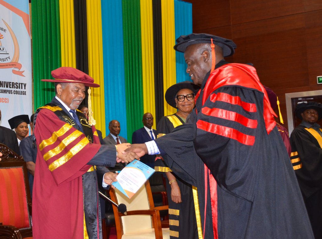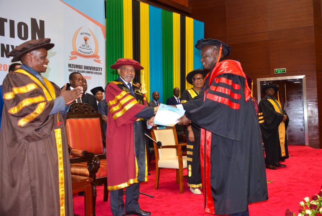 Kaimu Rasi wa Ndaki ya Dar es Salaam Prof. Cyriacus Binamungu (kulia) akipokea cheti cha pongezi cha mwanataaluma kutoka kwa Rais Mstaafu wa Serikali ya Mapinduzi Zanzibar ambaye pia ni Mkuu wa Chuo Kikuu Mzumbe Mhe. Dkt. Ali Mohamed Shein katika Mahafali ya 22 ya Chuo Kikuu Mzumbe Ndaki ya Dar es yaliyofanyika leo Desemba 14, 2023 katika Ukumbi wa Kituo Cha Kimataifa Cha Mikutano Julius Nyerere (JNICC) Jijini Dar es Salaam.