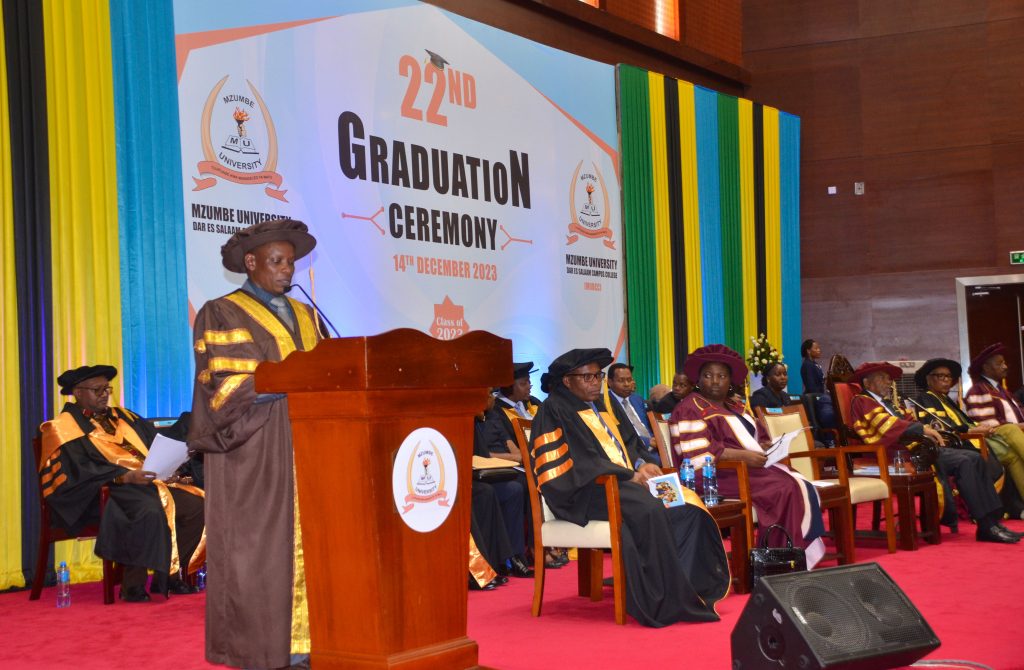 Kaimu Makamu Mkuu Chuo Kikuu Mzumbe Profesa William Mwegoha akizungumza katika Mahafali ya 22 ya Chuo Kikuu Mzumbe Ndaki ya Dar es yaliyofanyika leo Desemba 14, 2023 katikaUkumbi wa Kituo Cha Kimataifa Cha Mikutano Julius Nyerere (JNICC) Jijini Dar es Salaam.