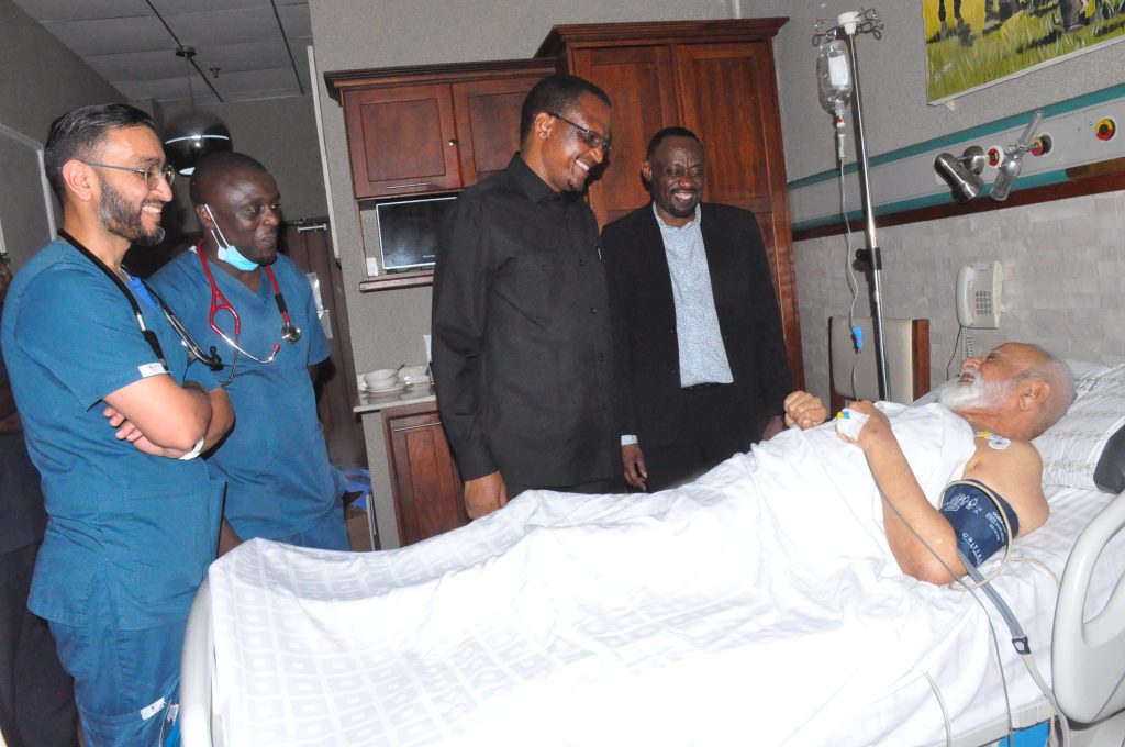 Katibu Mkuu wa Wizara ya Afya Dkt. John Jingu alimjulia hali Mchungaji Donald Lema ambaye amefanyiwa upasuaji mdogo wa moyo wa kubadilisha valvu ya mshipa mkubwa wa damu (Aortic Valve) bila kufungua kifua (Transcatheter Aortic Valve Implantation procedure – TAVI) katika Taasisi ya Moyo Jakaya Kikwete (JKCI). Kulia ni Mkurugenzi Mtendaji wa JKCI Dkt. Peter Kisenge.