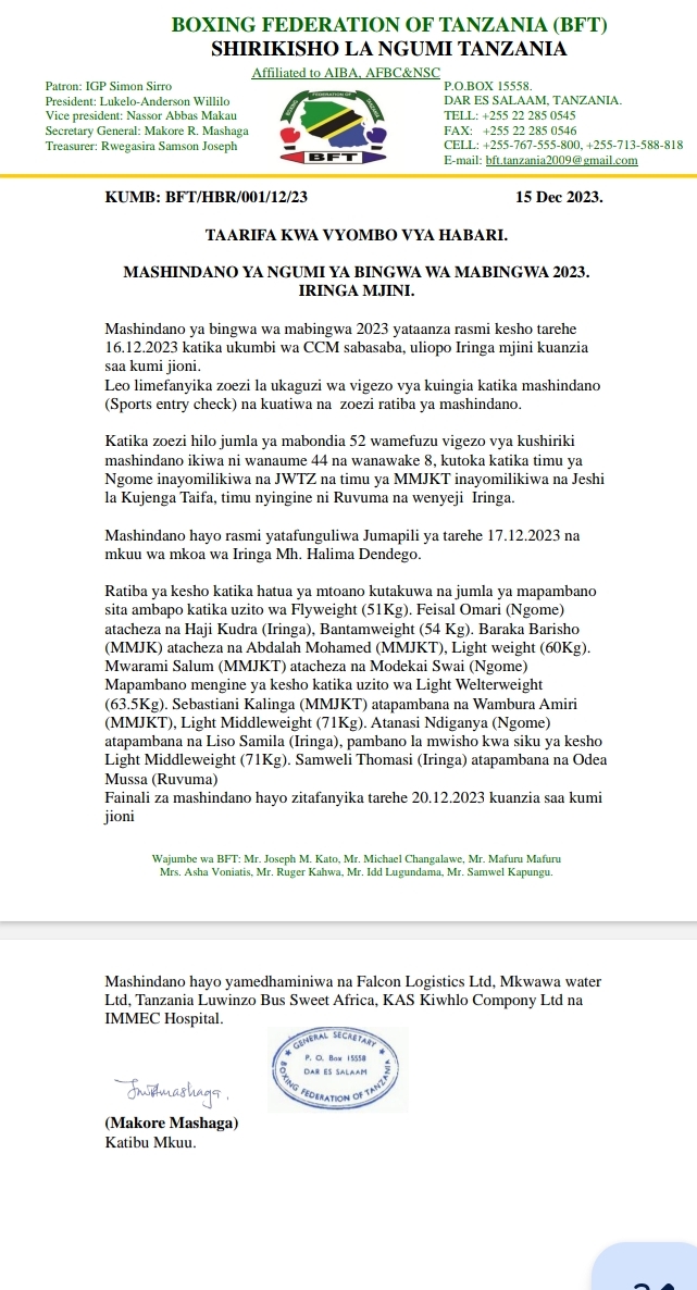 MchanganyikoMASHINDANO YA BINGWA WA MABINGWA IRINGA Last updated: 2023/12/15 at 11:19 PM John Bukuku 2 years ago Share SHARE John Bukuku December 15, 2023 December 15, 2023 Share this Article Facebook Twitter Email Print Previous Article ZIWA NYASA WAASWA KUFANYA SHUGHULI ZISIZOHARIBU MAZINGIRA Next Article TIA YATAKIWA KUONGEZA WIGO WA UPATIKANAJI WA HUDUMA ZAKE NCHINI