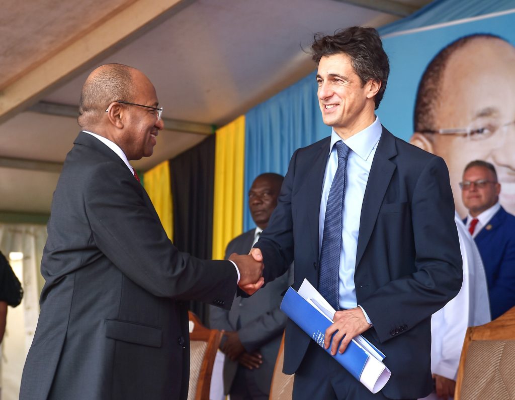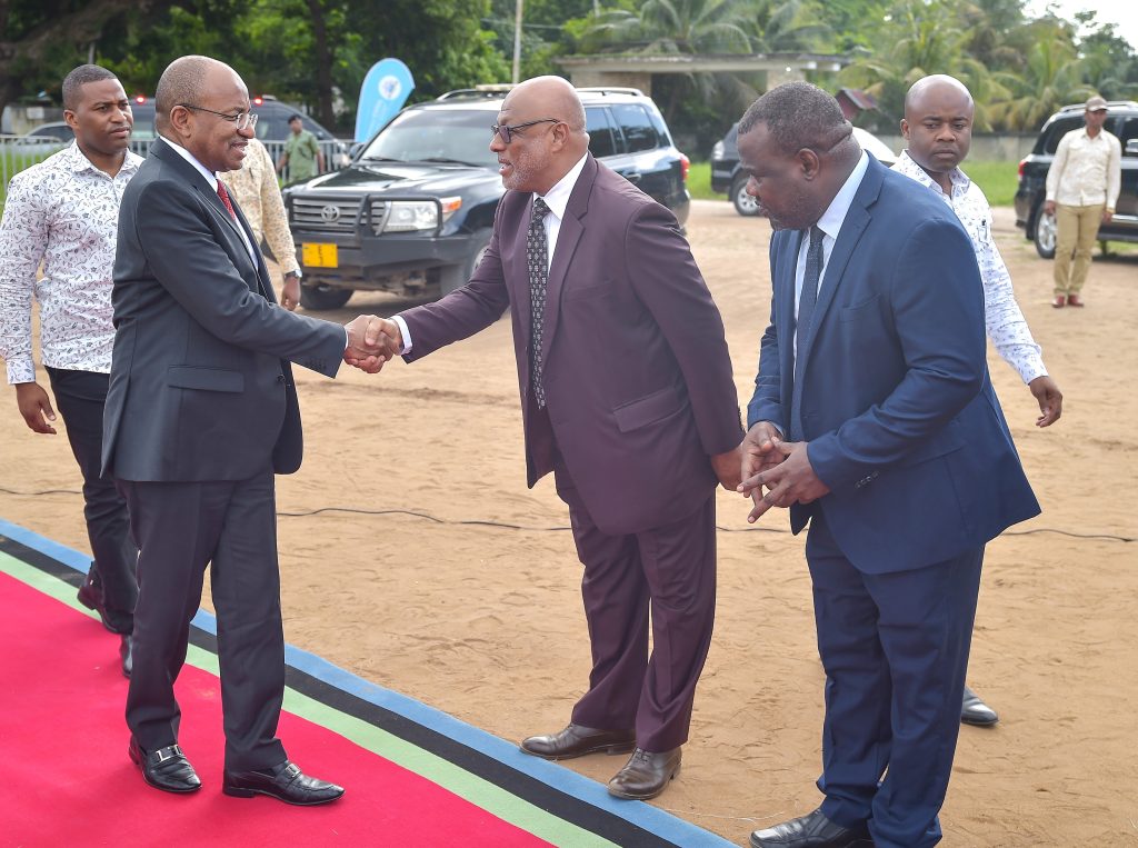 RAIS wa Zanzibar na Mwenyekiti wa Baraza la Mapinduzi Mhe.Dk.Hussein Ali Mwinyi akisalimiana na Mkurugenzi Mtendaji wa D-Tree International Bw. Recardo Rampaliele, alipowasili katika jukwaa kuu la Viongozi kwa ajili ya uzinduzi wa Mpango wa Kitaifa wa Wahudumu wa Afya Ngazi ya Jamii Zanzibar, uliofanyika katika viwanja vya Maisara Suleiman Wilaya ya Mjini Unguja Jijini Zanzibar leo 16-12-2023.(Picha na Ikulu).