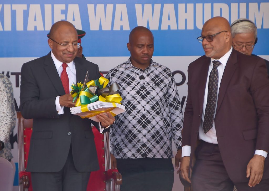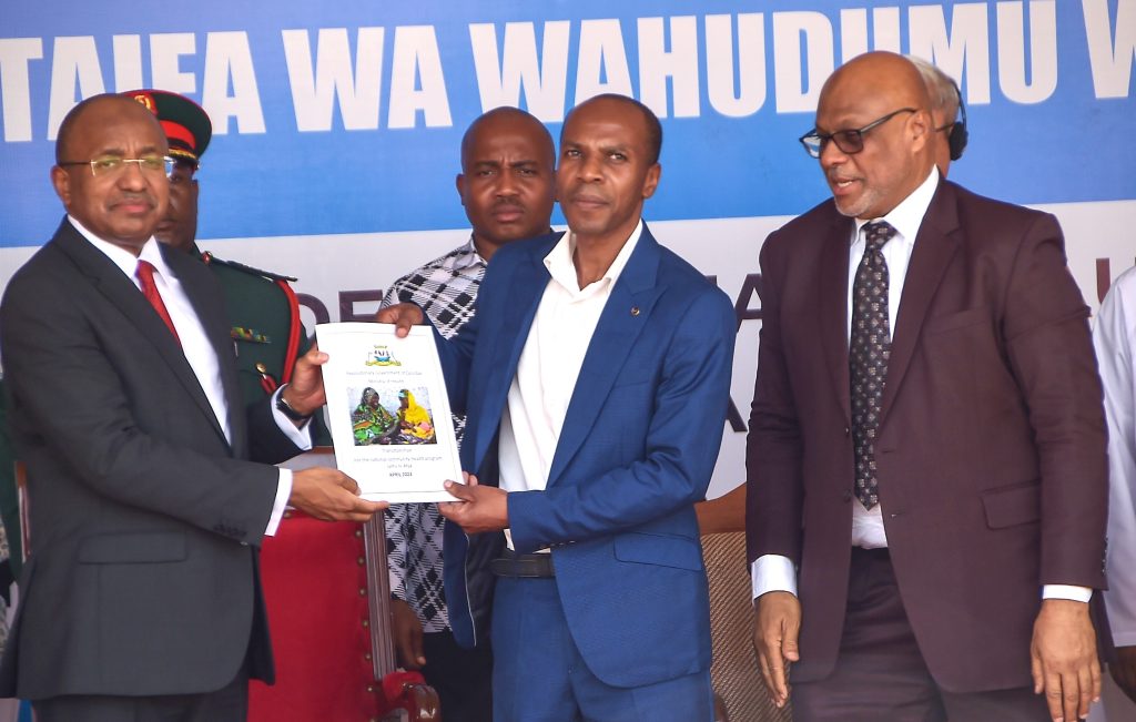 RAIS wa Zanzibar na Mwenyekiti wa Baraza la Mapinduzi Mhe.Dk.Hussein Ali Mwinyi akimkabidhi Kitabu cha Mpango wa Kitaifa wa Wahudumu wa Afya Ngazi ya Jamii Zanzibar Kaimu Katibu Mkuu wa Wizara ya Afya Zanzibar Dkt. Amour Suleiman Mohamme, baada ya uzinduzi huo uliofanyika katika viwanja vya Maisara Suleiman Wilaya ya Mjini Unguja leo 16-12-2023 na (kushoto kwake) Waziri wa Afya Zanzibar Mhe. Nassor Ahmed Mazrui.(Picha na Ikulu).