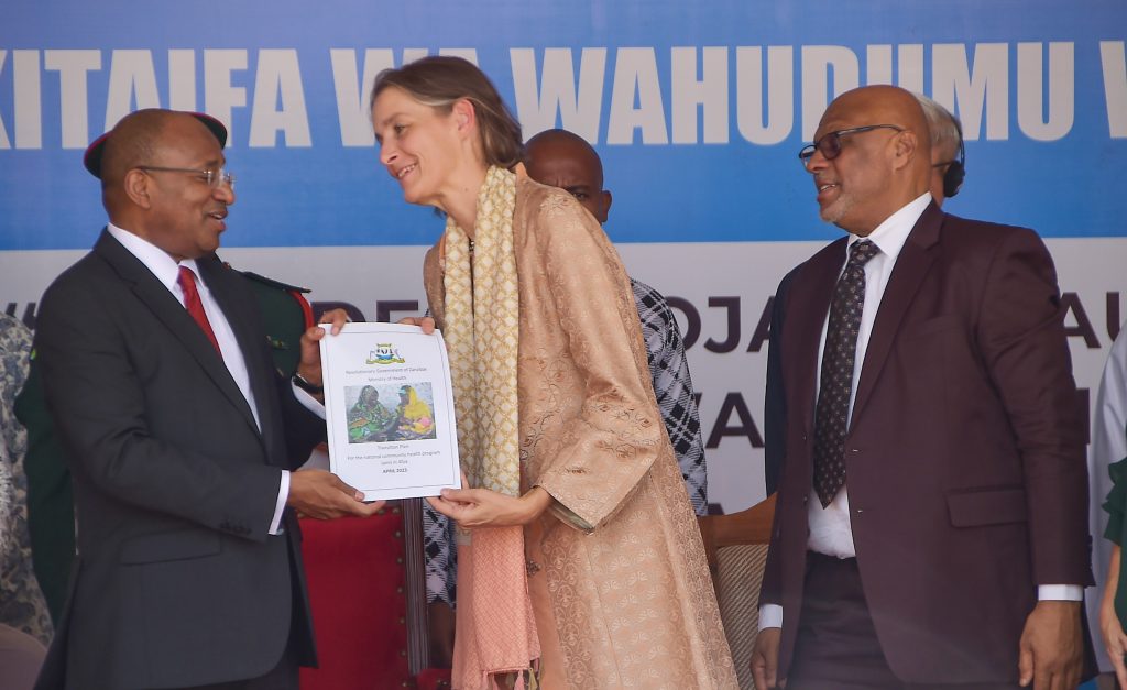 RAIS wa Zanzibar na Mwenyekiti wa Baraza la Mapinduzi Mhe.Dk.Hussein Ali Mwinyi akimkabidhi Kitabu cha Mpango wa Kitaifa wa Wahudumu wa Afya Ngazi ya Jamii Zanzibar, Mkurugenzi Mkaazi wa UNICEF Nchini Bi.Eike Wisch, baada ya uzinduzi huo uliofanyika katika viwanja vya Maisara Suleiman Wilaya ya Mjini Unguja leo 16-12-2023 na (kushoto kwake) Waziri wa Afya Zanzibar Mhe. Nassor Ahmed Mazrui.(Picha na Ikulu)