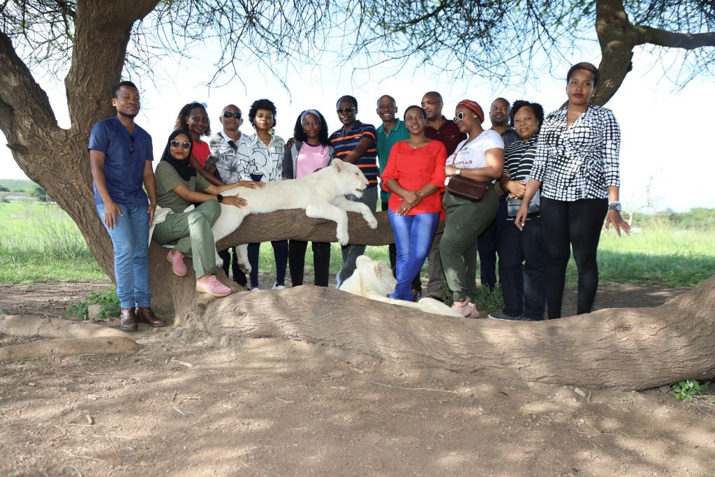 Naibu Waziri wa Afya na Mbunge wa jimbo la Siha Mhe. Dkt. Godwin Mollel na wataalamu wa Taasisisi ya Moyo Jakaya Kikwete (JKCI) wakiwa katika picha ya pamoja na simba mweupe walipotembelea shamba la wanyamapori Serval Wildlife kwaajili ya kufanya utalii wa ndani. Wataalamu wa JKCI walikuwa katika Hospitali ya Wilaya ya Siha kwaajili ya kutoa huduma za upimaji na matibabu ya moyo.