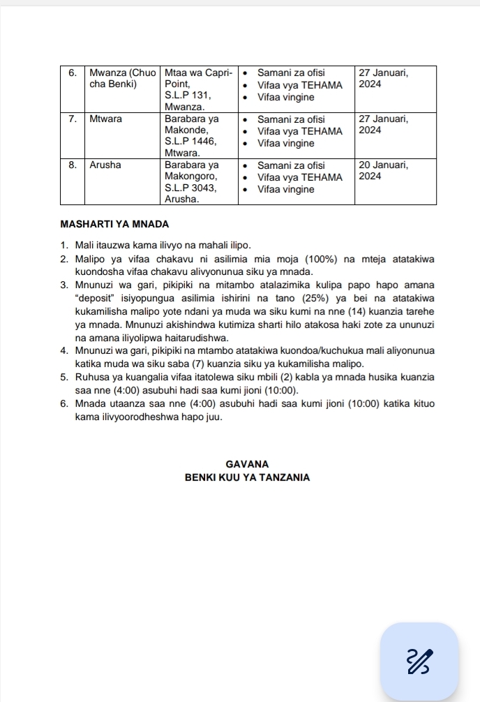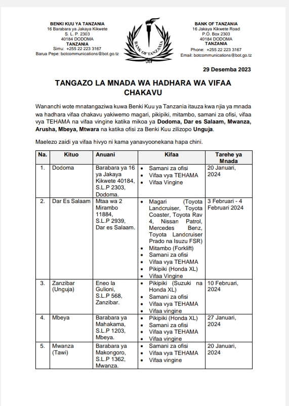 MchanganyikoBoT YATANGAZA MNADA WA HADHARA WA VIFAA CHAKAVU Last updated: 2023/12/29 at 8:46 PM John Bukuku 2 years ago Share SHARE John Bukuku December 29, 2023 December 29, 2023 Share this Article Facebook Twitter Email Print Previous Article DEREVA MMOJA AFUTIWA LESENI NA WAWILI MBARONI Next Article PITIA VICHWA VYA HABARI KATIKA MAGAZETI YA LEO DESEMBA 30,2023