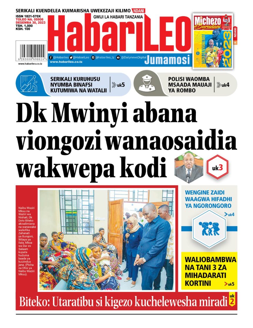MagazetiPITIA VICHWA VYA HABARI KATIKA MAGAZETI YA LEO DESEMBA 30,2023 Last updated: 2023/12/29 at 9:05 PM Alex Sonna 2 years ago Share SHARE Alex Sonna December 29, 2023 December 29, 2023 Share this Article Facebook Twitter Email Print Previous Article BoT YATANGAZA MNADA WA HADHARA WA VIFAA CHAKAVU Next Article MILIONI 331 KUMALIZA KERO YA MAJI KWA WAKAZI 3,000 WA KIJIJI CHA MCHONDA WILAYANI NACHINGWEA