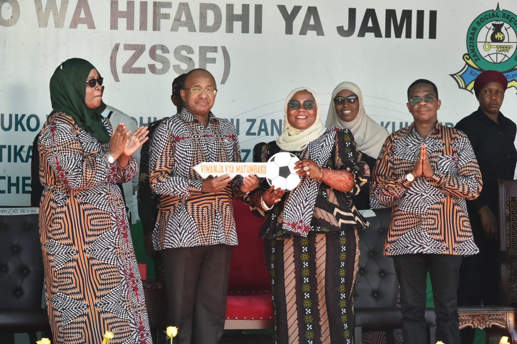 Rais wa Zanzibar na Mwenyekiti wa Baraza la Mapinduzi Dk.Hussein Ali Mwinyi (wa pili kushoto) akimkabidhi mfano wa Funguo Waziri wa Habari,Vijana,Utamaduni na Michezo Mhe.Tabia Maulid Mwita katika hafla ya ufunguzi rasmi wa Viwanja vya Matumbaku Sports Komplex Miembeni ,Wilaya ya Mjini Mkoa wa Mjini Magharibi leo katika maadhimisho ya shamra shamra za miaka 60 ya Mapinduzi Matukufu ya Zanzibar(kulia) Mkurugenzi Mwendeshaji wa Mfuko wa Hifadhi ya Jamii (ZSSF) Ndg,Nassor Shaaban Ameir (kushoto) Waziri wa Fedha na Mipango Dkt. Saada Mkuya Salum. [Picha na Ikulu] 30/12/2023.
