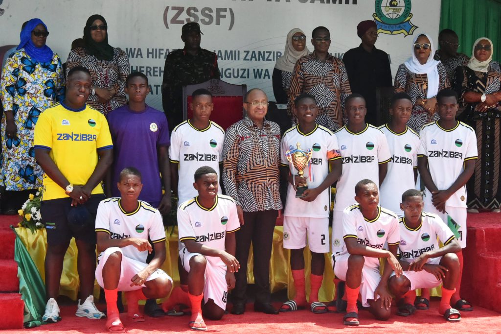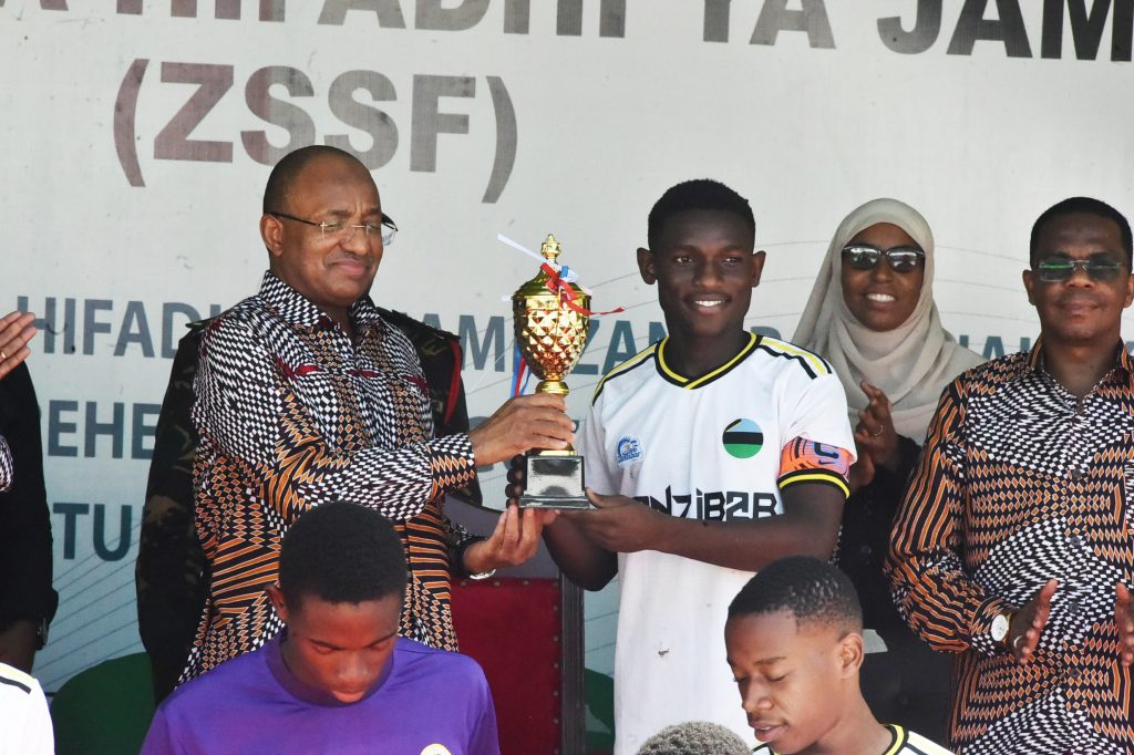 Rais wa Zanzibar na Mwenyekiti wa Baraza la Mapinduzi Dk.Hussein Ali Mwinyi akimkabidhi kikombe Nahodha wa Timu ya Karume Boys Ashraf Ali Othman, baada ya ushindi na Timu ya ZSSF katika mchezo wa Ufunguzi wa Vyanja vya Matumbaku Sports Komplex Miembeni Wilaya ya Mjini Mkoa wa Mjini Magharibi leo katika maadhimisho ya shamra shamra za miaka 60 ya Mapinduzi Matukufu ya Zanzibar(kulia) Mkurugenzi Mwendeshaji wa Mfuko wa Hifadhi ya Jamii (ZSSF) Ndg,Nassor Shaaban Ameir . [Picha na Ikulu] 30/12/2023.