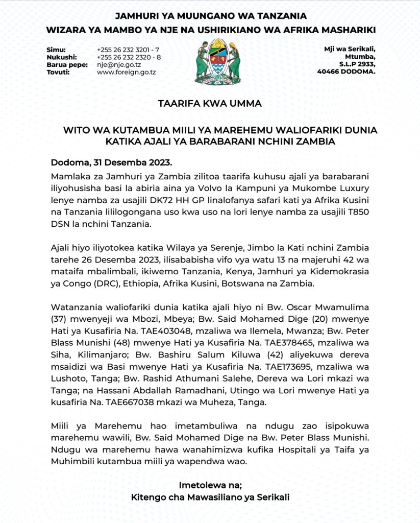 MchanganyikoWATAKIWA KWENDA MUHIMBILI KUTAMBUA MIILI YA AJALI YA BASI LA MKOMBE ILIYOTOKEA NCHINI ZAMBIA Last updated: 2023/12/31 at 4:45 PM John Bukuku 2 years ago Share SHARE John Bukuku December 31, 2023 December 31, 2023 Share this Article Facebook Twitter Email Print Previous Article WAZAZI TUWAJIBIKE KWENYE MALEZI YA WATOTO WETU:ASEMA DKT BITEKO Next Article JESHI LA POLISI LA MTIA MBARONI MTUHUMIWA ALIYEMUA BEATRICE MINJA.