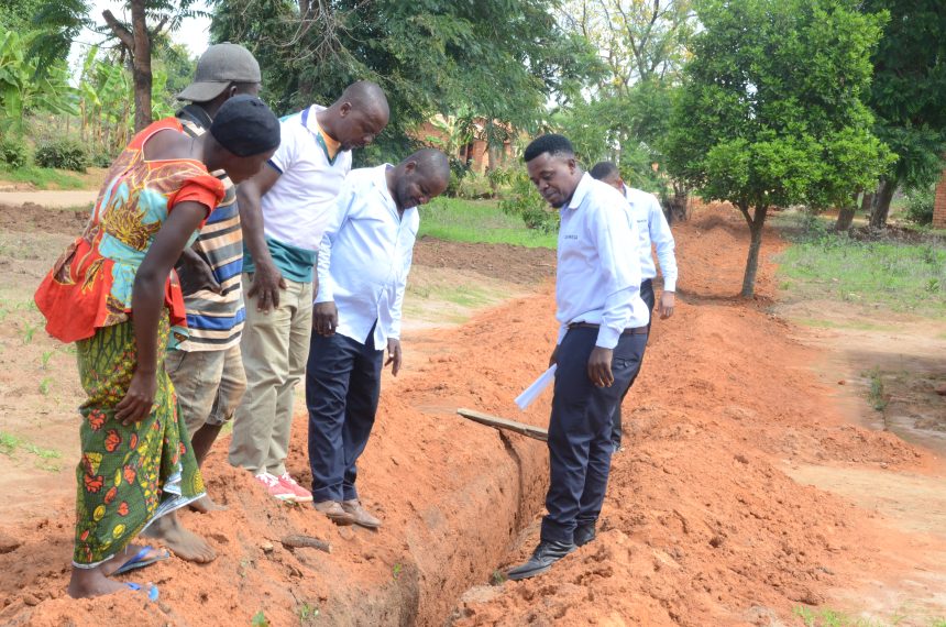 Mhandisi wa maji kutoka ofisi ya Mamlaka ya maji na usafi wa mazingira manispaa ya Songea(Souwasa) Charles Kitavile kulia na baadhi ya watumishi wa Souwasa wakikagua shughuli za uchimbaji wa mtaro wa maji katika kata ya Subira.