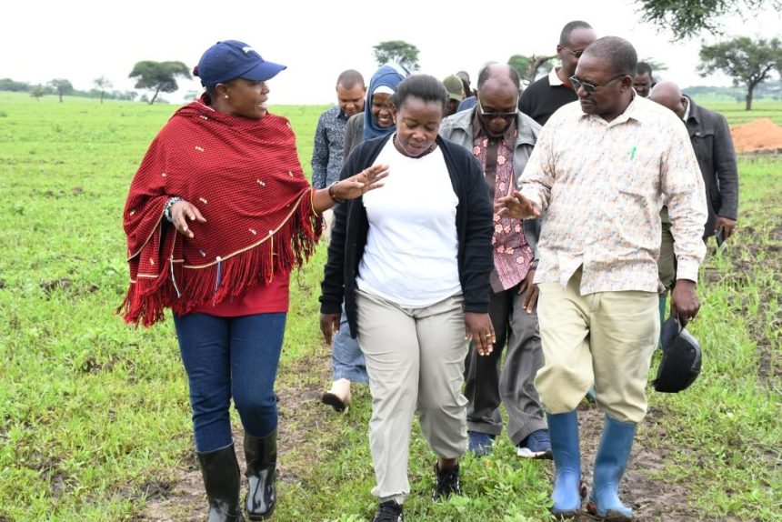 Mkuu wa mkoa wa Manyara Queen Sendiga akisisitiza jambo mbele ya Naibu Waziri wa Ardhi Nyumba na Maendeleo ya Makazi Mhe. Geophrey Pinda pamoja na Kamishna wa Ardhi Msaidizi mkoa wa Manyara Wenceslaus Mtui wakati alipokwenda kukagua eneo watakalohamishiwa waathirika wa Mafuriko yaliyotokana na maporomoko ya mawe na tope kutoka mlima Hanang tarehe 5 Januari 2024. (PICHA ZOTE NA WIZARA YA ARDHI)