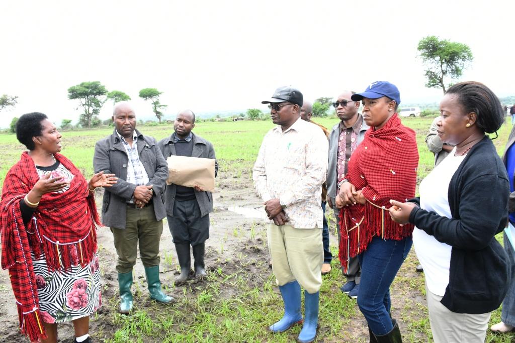 Naibu Waziri wa Ardhi Nyumba na Maendeleo ya Makazi Mhe. Geophrey Pinda akimsikiliza Mwenyekiti wa Halmashauri ya Hanang Rose Kamili (kushoto) alipokwenda kukagua eneo watakalohamishiwa waathirika wa Mafuriko yaliyotokana na maporomoko ya mawe na tope kutoka mlima Hanang tarehe 5 Januari 2024.