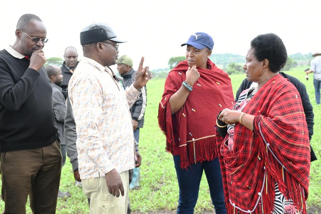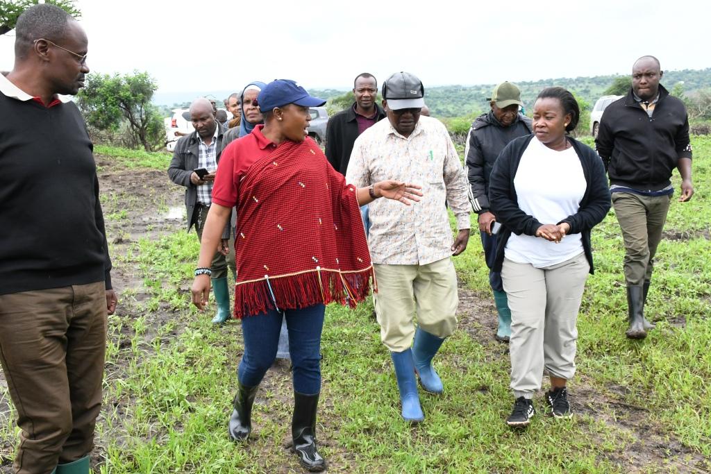 Mkuu wa mkoa wa Manyara Queen Sendiga akisisitiza jambo mbele ya Naibu Waziri wa Ardhi Nyumba na Maendeleo ya Makazi Mhe. Geophrey Pinda pamoja na Kamishna wa Ardhi Msaidizi mkoa wa Manyara Wenceslaus Mtui wakati alipokwenda kukagua eneo watakalohamishiwa waathirika wa Mafuriko yaliyotokana na maporomoko ya mawe na tope kutoka mlima Hanang tarehe 5 Januari 2024. (PICHA ZOTE NA WIZARA YA ARDHI)