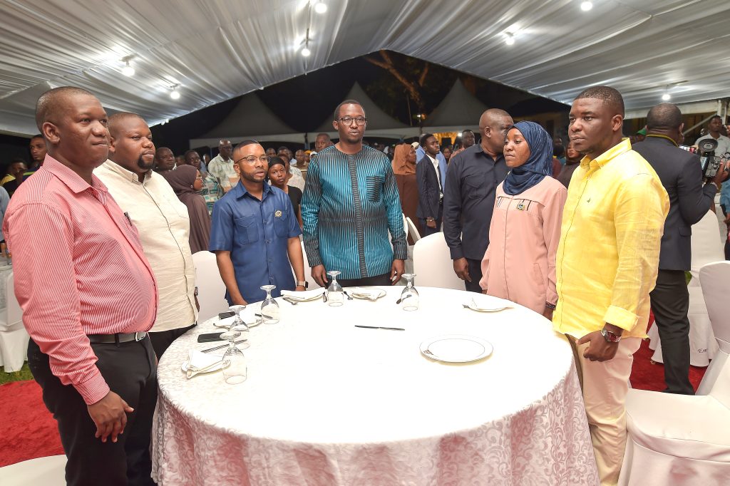 WAZIRI wa Nchi Ofisi ya Rais Ikulu Zanzibar Mhe.Jamali Kassim Ali akiwa na Viongozi wa Jumuiya ya Umoja wa Vijana wa Chama Cha Mapinduzi (UVCCM) wakiwa katika viwanja vya Ikulu Jijini Zanzibar wakati ukipigwa wimbo wa Taifa na wa Afrika Mashariki kabla ya kuaza kwa hafla ya dhifa maalum ya chakula cha usiku iliyoandaliwa na Makamu Mwenyekiti wa Chama cha Mapinduzi (CCM) Zanzibar, ambae pia ni Rais wa Zanzibar na Mwenyekiti wa Baraza la Mapinduzi Mhe Dk.Hussein Ali Mwinyi iliyofanyika katika viwanja vya Ikulu Jijini Zanzibar jana usiku 9-1-2024.(Picha na Ikulu)