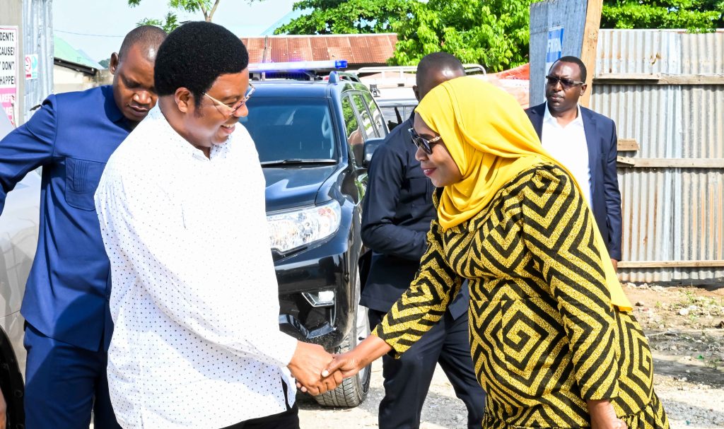 Waziri Mkuu Kassim Majaliwa akisalimiana na Mkuu wa Wilaya ya Magharibi, Susan Kunambi, wakati alipowasili katika eneo la Kibanda Maiti, kuweka jiwe la Msingi Sikuli ya Muungano, iliyopo katika Wilaya ya Mjini, mkoa wa Mjini Magharibi, Zanzibar 10.1.2024. (Picha na Ofisi ya Waziri Mkuu)