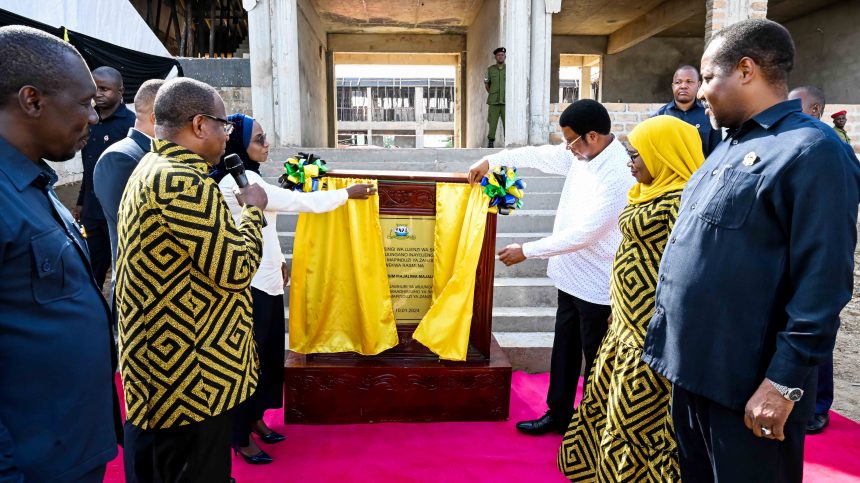Waziri Mkuu Kassim Majaliwa akipewa maelezo na Mshauri Elekezi wa mradi huo, Mhandisi Salmin Hassan Ally kutoka Wakala wa Majengo Zanzibar (ZBA), kabla ya kuweka jiwe la Msingi Sikuli ya Muungano, iliyopo katika Wilaya ya Mjini, mkoa wa Mjini Magharibi, Zanzibar 10.1.2024. (Picha na Ofisi ya Waziri Mkuu)
