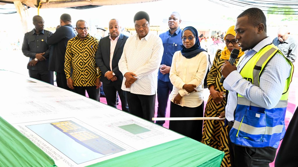 Waziri Mkuu Kassim Majaliwa akipewa maelezo na Mshauri Elekezi wa mradi huo, Mhandisi Salmin Hassan Ally kutoka Wakala wa Majengo Zanzibar (ZBA), kabla ya kuweka jiwe la Msingi Sikuli ya Muungano, iliyopo katika Wilaya ya Mjini, mkoa wa Mjini Magharibi, Zanzibar 10.1.2024. (Picha na Ofisi ya Waziri Mkuu)