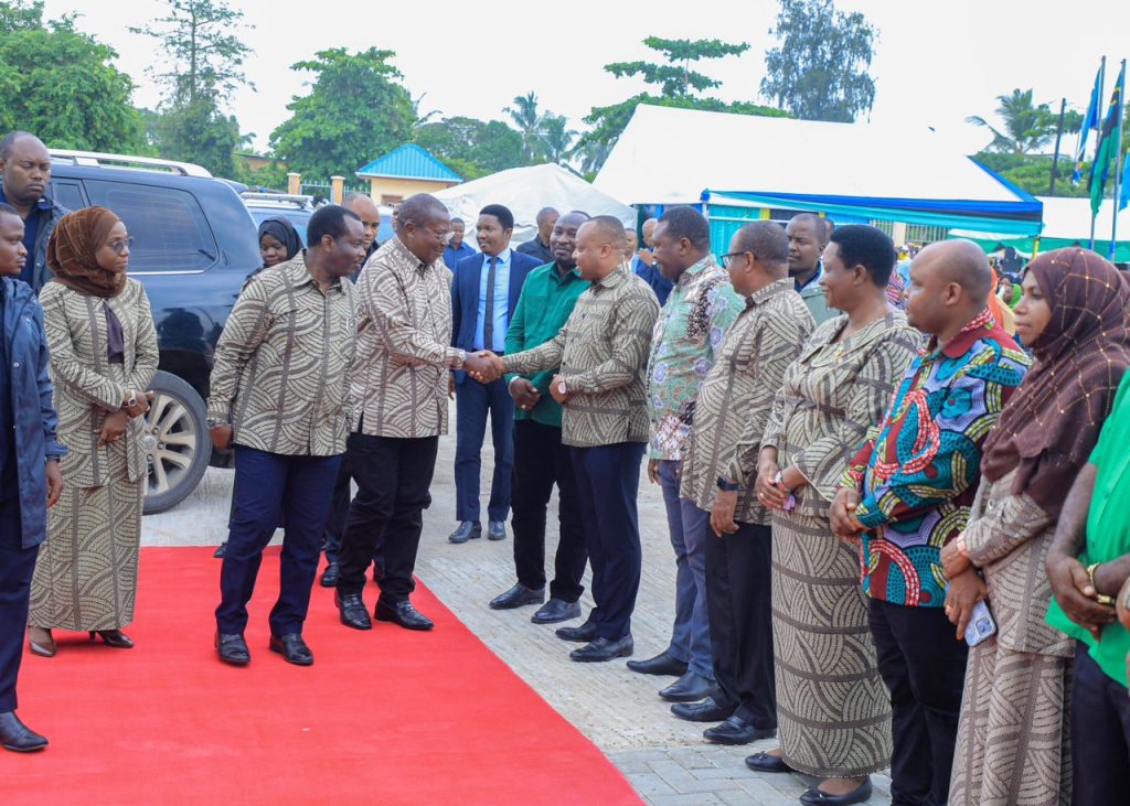 Makamu wa Rais wa Jamhuri ya Muungano wa Tanzania Mhe. Dkt. Philip Mpango akisalimiana na viongozi mbalimbali wakati alipowasili katika ufunguzi wa Skuli ya Msingi ya Elimu Mjumuisho Jendele iliyopo Wilaya ya Kati, Unguja ikiwa ni shamrashamra za Maadhimisho ya Miaka 60 ya Mapinduzi Matukufu ya Zanzibar. Tarehe 11 Januari 2024.