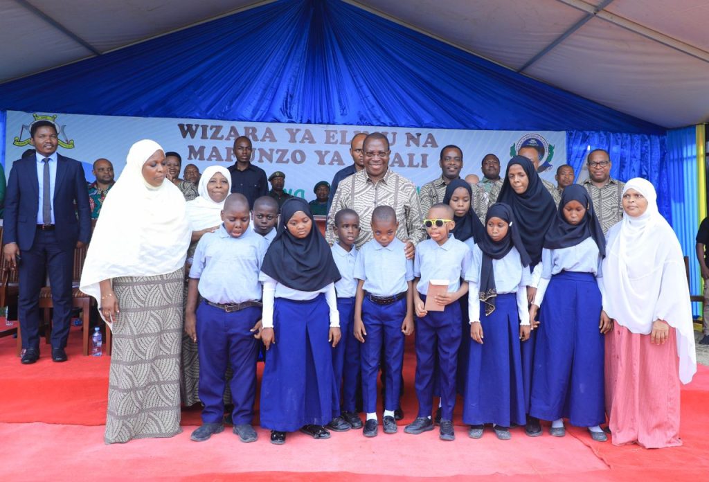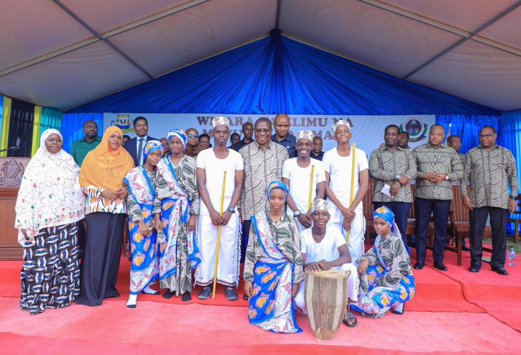 Makamu wa Rais wa Jamhuri ya Muungano wa Tanzania Mhe. Dkt. Philip Mpango akiwa katika picha ya pamoja na wanafunzi viziwi pamoja na walimu wao ambao wanafanya Sanaa ya kucheza ngoma wakati wa ufunguzi wa Skuli ya Msingi ya Elimu Mjumuisho Jendele iliyopo Wilaya ya Kati, Unguja ikiwa ni shamrashamra za Maadhimisho ya Miaka 60 ya Mapinduzi Matukufu ya Zanzibar. Tarehe 11 Januari 2024