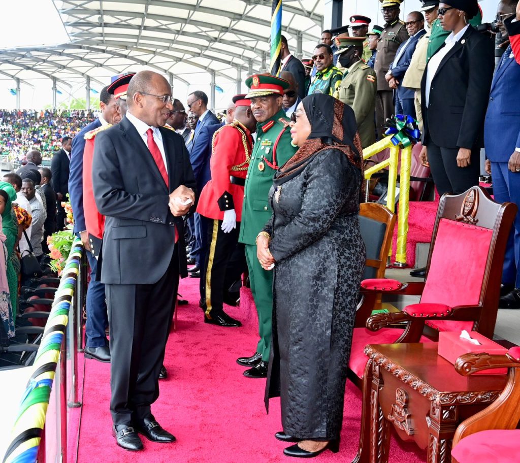 Rais wa Jamhuri ya Muungano wa Tanzania Mhe. Samia Suluhu Hassan akisalimiana na Rais wa Zanzibar na Mwenyekiti wa Baraza la Mapinduzi Mhe. Dkt. Hussein Ali Mwinyi wakati wa maadhimisho ya miaka 60 ya Mapinduzi ya Zanzibar yaliyofanyika kwenye uwanja wa Amani tarehe 12 Januari,2024.