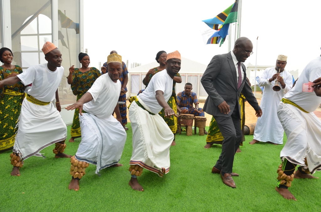 Naibu waziri wa Viwanda na Biashara WA Serikali ya jamuhuri ya muungano wa Tanzania Exaud Kigahe akicheza Ngoma ya kibati pamoja na wasanii wa Ngoma hiyo kutoka Chuo cha mafunzo wakati alipofika kufungua mkutano wa wakuu wa TAASISI za SMT na SMZ uliojadili mchango na mafanikio ya Taasisi hizo katika miaka 60 ya Mapinduzi ,Hafla iliyofanyika Ukumbi wa Dkt Hussein Mwinyi eneo la maenesho ya Biashara nyamazi Zanzibar