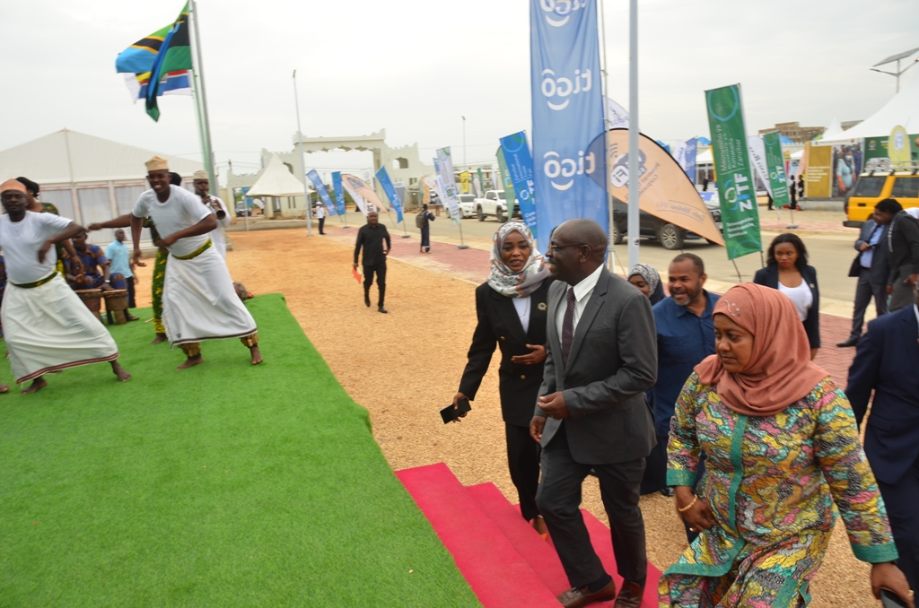 Naibu waziri wa Viwanda na Biashara WA Serikali ya jamuhuri ya muungano wa Tanzania Exaud Kigahe akipokelewa kwa Ngoma ya kibati kutoka kwa wasanii wa Chuo cha mafunzo wakati alipofika kufungua mkutano wa wakuu wa TAASISI za SMT na SMZ uliojadili mchango na mafanikio ya Taasisi hizo katika miaka 60 ya Mapinduzi ,Hafla iliyofanyika Ukumbi wa Dkt Hussein Mwinyi eneo la maenesho ya Biashara nyamazi Zanzibar