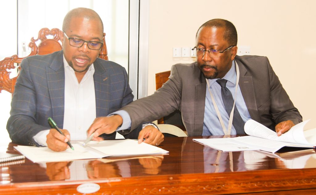 Katibu Mkuu-IKULU, Bw. Mululi Majula Mahendeka akifafanua jambo kwa Naibu Waziri, Ofisi ya Rais, Menejimenti ya Utumishi wa Umma na Utawala Bora, Mhe. Ridhiwani Kikwete (katikati) kabla ya kuanza kwa kikao cha Kamati ya Kudumu ya Bunge ya Utawala, Katiba na Sheria na kuhusu utekelezaji wa maazimio ya Bunge kwa Wakala ya Ndege za Serikali, Mamlaka ya Serikali Mtandao na Sekretarieti ya Ajira katika Utumishi wa Umma.