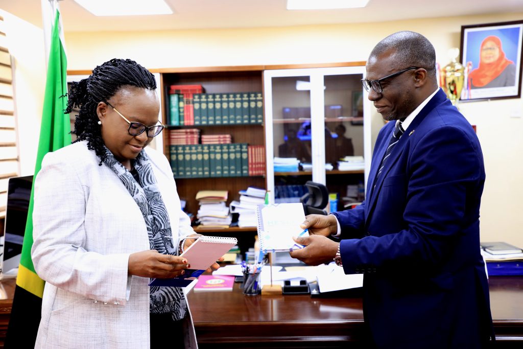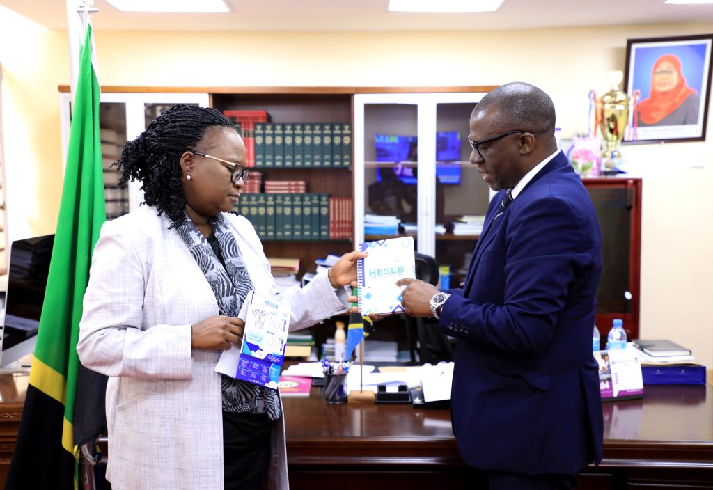 Katibu wa Bunge, Ndg. Nenelwa Mwihambi, ndc akikabidhiwa machapisho na Mkurugenzi Mtendaji wa Bodi ya Mikopo ya Wanafunzi wa Elimu ya Juu (HESLB), Ndg. Abdul-Razaq Badru, alipomtembelea leo tarehe 18 Januari, 2024 ofisini kwake Bungeni Jijini Dodoma.