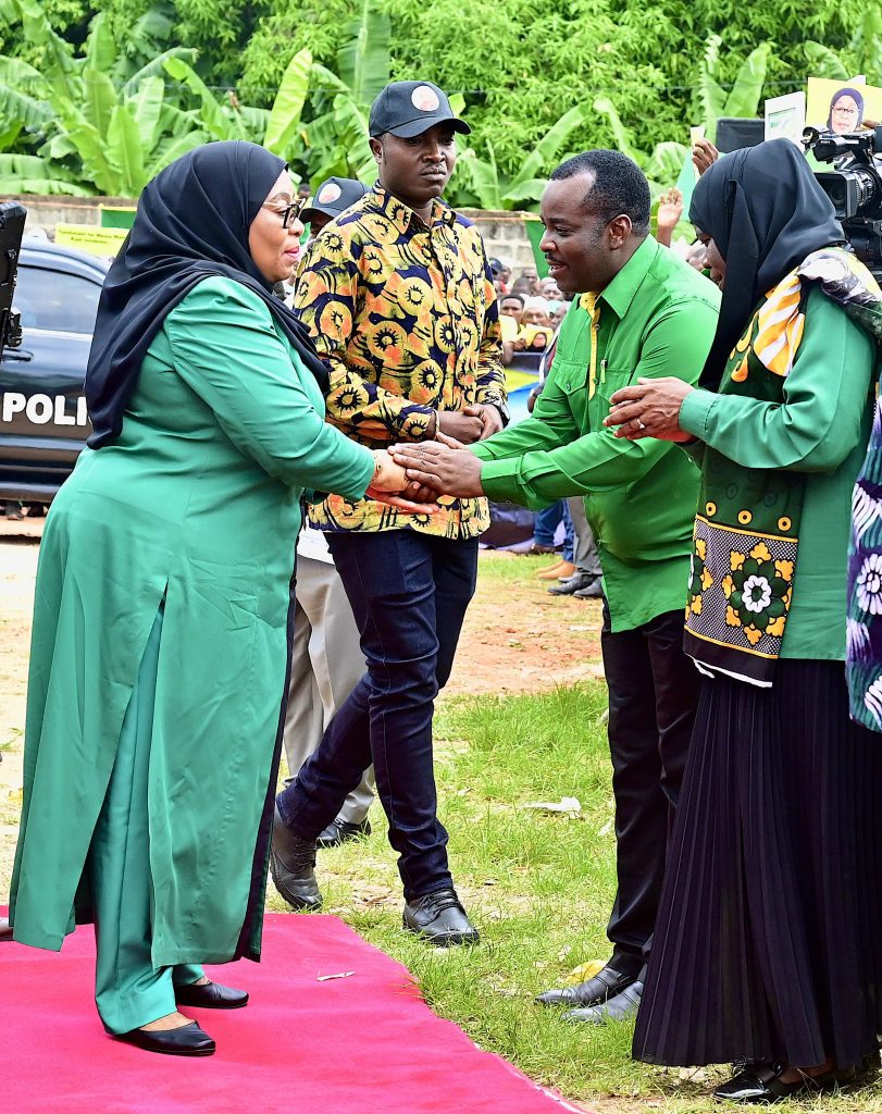 Mwenyekiti wa Chama cha Mapinduzi CCM na Rais wa Jamhuri ya Muungano wa Tanzania Ndugu. Samia Suluhu Hassan, akisalimiana na Viongozi, Wanachama wa Chama cha Mapinduzi (CCM) na Wananchi wa Mkoa wa Kusini Unguja alipowasili katika Viwanja vya Tawi la CCM Tasani Makunduchi kwa ajili ya kuzindua Uboreshaji wa Tawi hilo tarehe 18 Januari, 2024.