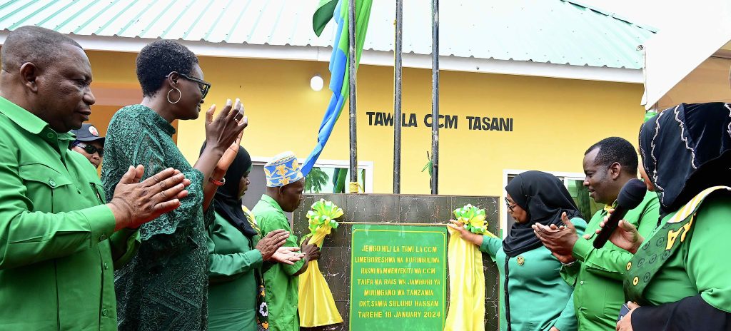 Mwenyekiti wa Chama cha Mapinduzi CCM na Rais wa Jamhuri ya Muungano wa Tanzania Ndugu. Samia Suluhu Hassan, akiondoa kitambaa kuashiria uzinduzi wa Uboreshaji wa Tawi la Chama cha Mapinduzi (CCM) Tasani Makunduchi Mkoa wa Kusini Unguja wakati alipokuwa kwenye ziara ya kutembelea na kukagua miradi mbalimbali ya Chama cha Mapinduzi (CCM) tarehe 18 Januari, 2024.