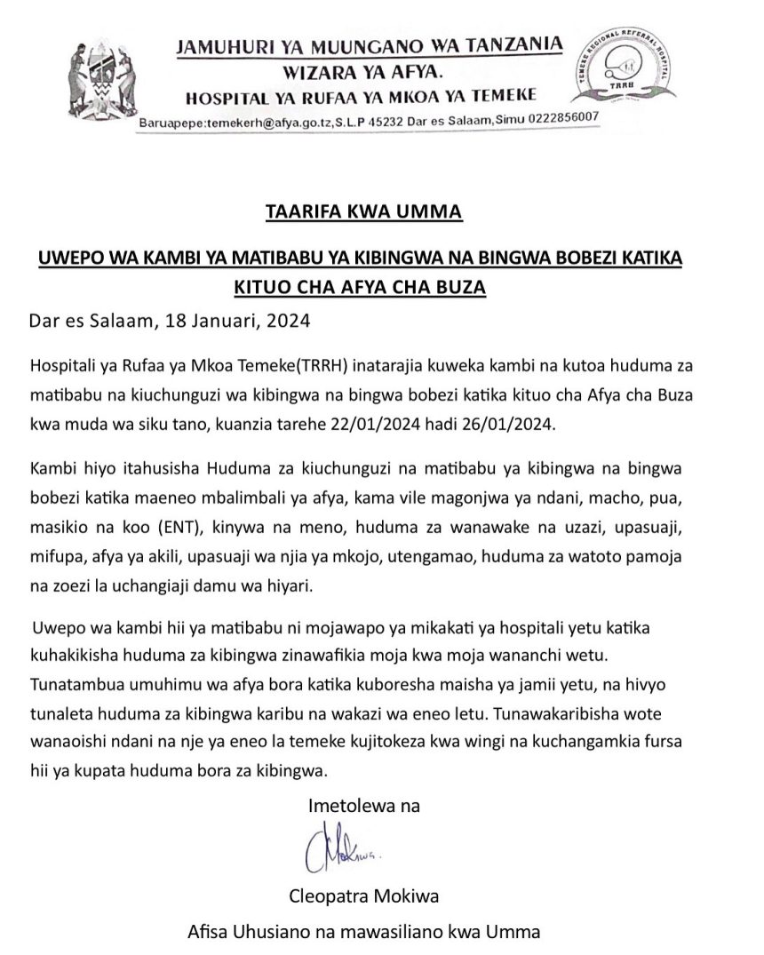 MchanganyikoTAARIFA KWA UMMA: UWEPO WA KAMBI YA MATIBABU YA KIBINGWA NA BINGWA BOBEZI KATIKA KITUO CHA AFYA CHA BUZA Last updated: 2024/01/18 at 1:58 PM John Bukuku 2 years ago Share SHARE John Bukuku January 18, 2024 January 18, 2024 Share this Article Facebook Twitter Email Print Previous Article KATIBU NENELWA AFANYA MAZUNGUMZO NA MKURUGENZI MTENDAJI WA HESLB JIJINI DODOMA Next Article MWENYEKITI WA CCM RAIS DKT. SAMIA AFANYA ZIARA YA KICHAMA KUKAGUA MIRADI MKOA WA KUSINI UNGUJU