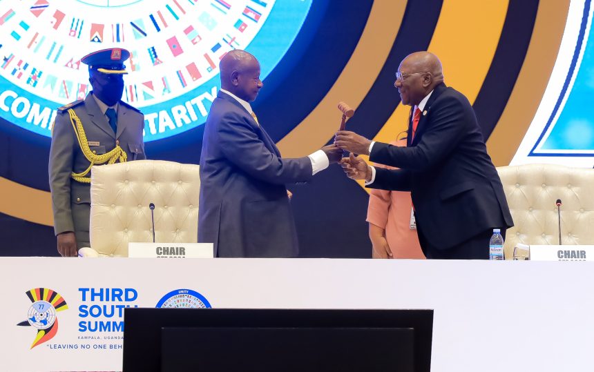 Makamu wa Kwanza wa Rais wa Cuba, Salvador Antonio Valdes Mesa akimkabidhi rasmi Rais wa Uganda Yoweri Museveni uenyekiti wa Kusini wa Kundi la 77 na China, Kampala nchini Uganda, Januari 21, 2024. Mheshimiwa Majaliwa amehudhuria mkutano huo kwa niaba ya Rais Dkt. Samia Suluhu Hassan.