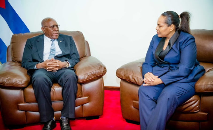 Makamu wa Rais wa Jamhuri ya Cuba, Mhe. Salvador Valdés Mesa akizungumza na Waziri wa Maliasili na Utalii, Mhe. Angellah Kairuki katika Uwanja wa Ndege wa Kimataifa wa Julius Nyerere, Jijini Dar es Salaam.