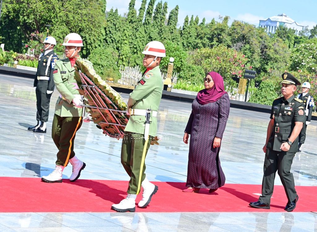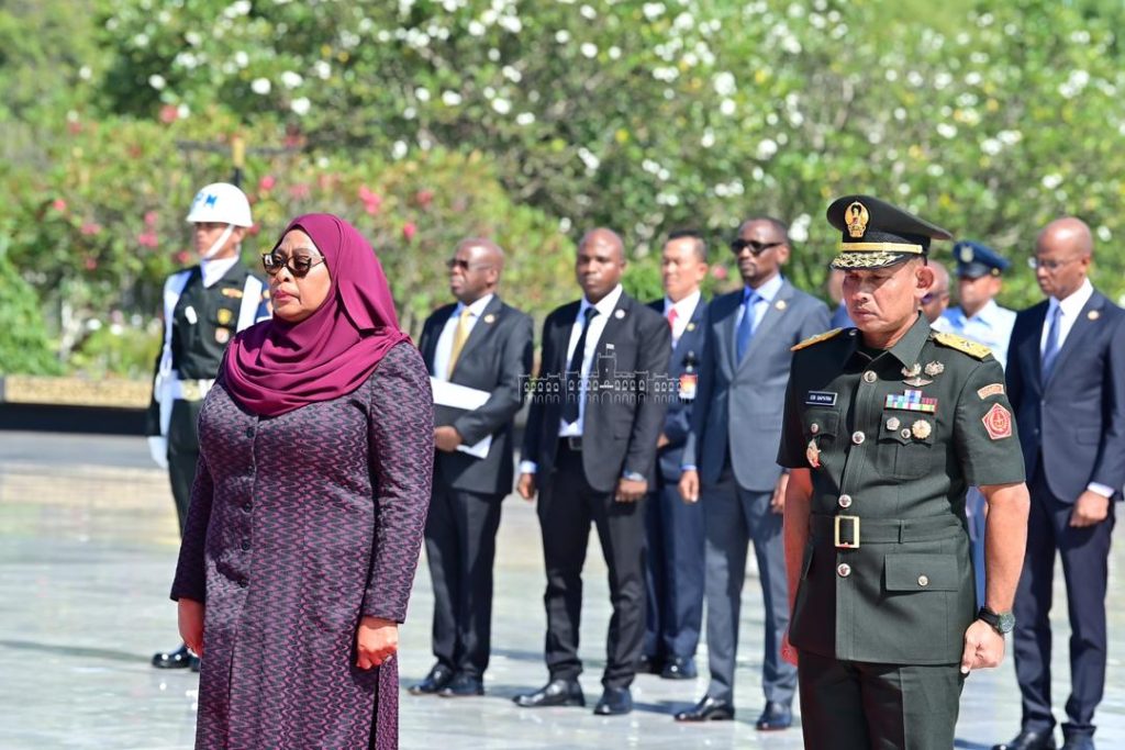 Rais wa Jamhuri ya Muungano wa Tanzania Mhe. Samia Suluhu Hassan akielekea kuweka shada la maua kwenye mnara wa kumbukumbu ya Makaburi ya Mashujaa ya Kalibata wakati wa ziara yake ya Kitaifa Jakarta nchini Indonesia tarehe 25 Januari,2024.
