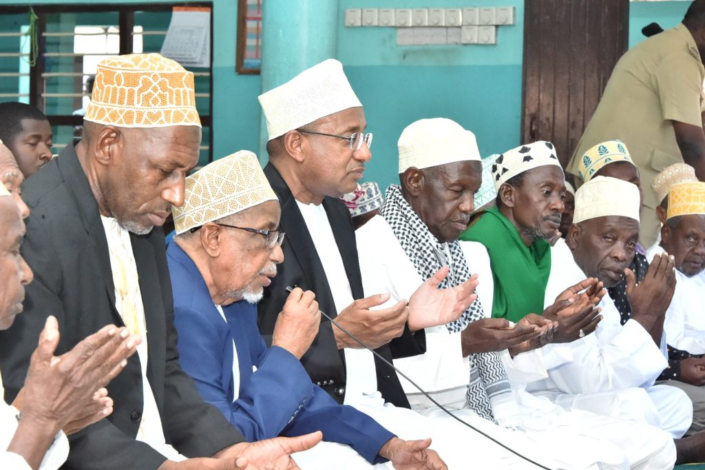 Rais wa Zanzibar na Mwenyekiti wa Baraza la Mapinduzi Alhaj Dk.Hussein Ali Mwinyi (wa tatu kushoto) pamoja na waumini wengine wakiitikia dua iliyoombwa na Mufti Mkuu wa Zanzibar Sheikh Saleh Omar Kabi, baada ya Swala ua Ijumaa katika Masjid Twauba Mwembemakumbi Wilaya ya Mjini Mkoa wa Mjini Magharibi leo ikiwa nikawaida yake kushiriki Ibada katika Misikiti mbali mbali Nchini.[Picha na Ikulu] 26/01/2024.