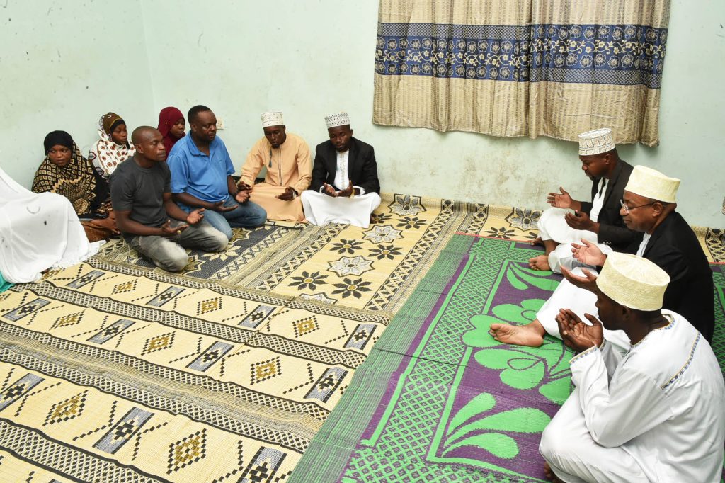 Rais wa Zanzibar na Mwenyekiti wa Baraza la Mapinduzi Alhaj Dk.Hussein Ali Mwinyi (kulia katikati) pamoja na Familia ya Marehemu Sheikh Machano Makame mtaa wa Mwembemakumbi Wilaya ya Mjini Mkoa wa Mjini Magharibi wakiitikia dua baada ya kuwafariji kwa Kifo cha Mzee wao aliyefariki hivi karibuni. [Picha na Ikulu] 26/01/2024.