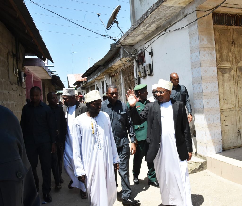 Rais wa Zanzibar na Mwenyekiti wa Baraza la Mapinduzi Alhaj Dk.Hussein Ali Mwinyi (kulia) akiwapungia mkono majirani wa Familia ya Marehemu Sheikh Machano Makame mtaa wa Mwembemakumbi Wilaya ya Mjini Mkoa wa Mjini Magharibi leo baada ya kuifariji familia hiyo kwa Kifo cha Mzee wao aliyefariki hivi karibuni. [Picha na Ikulu] 26/01/2024.