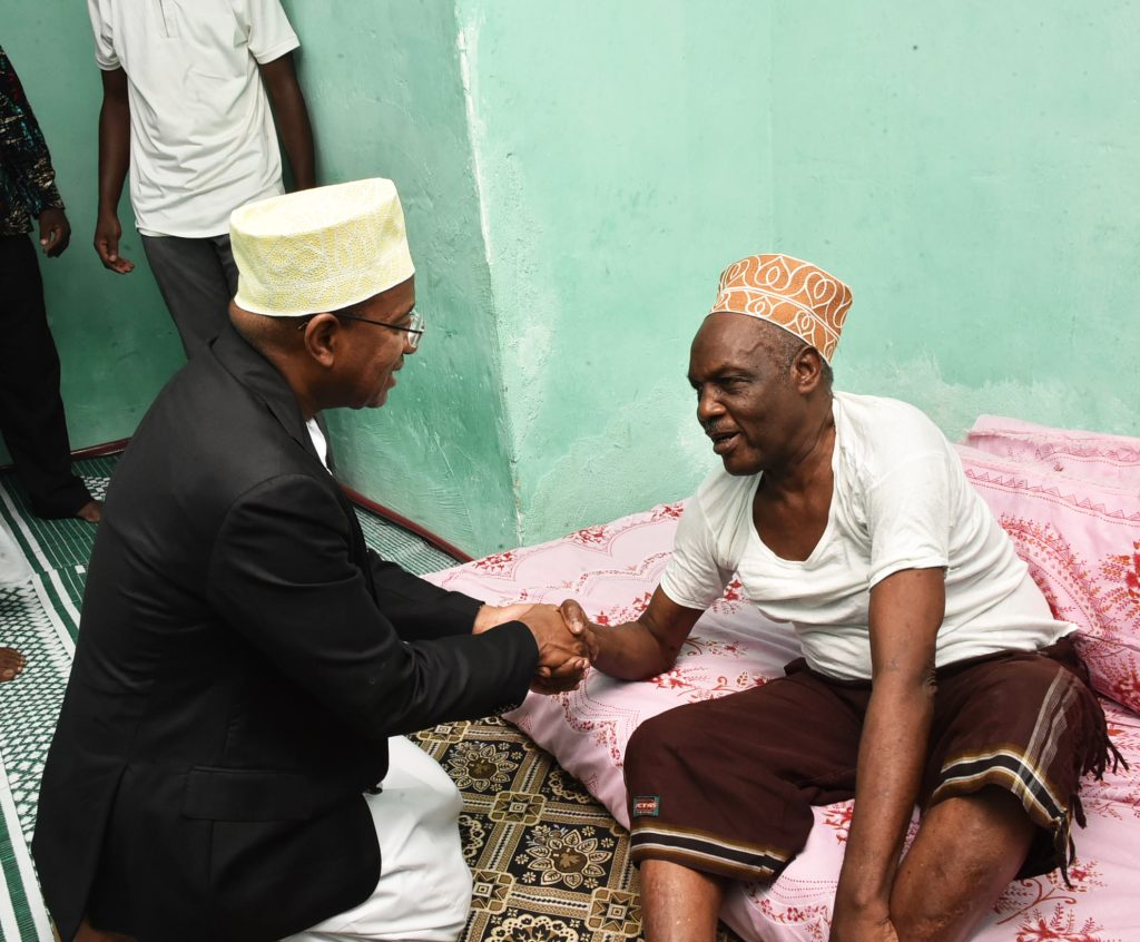 Rais wa Zanzibar na Mwenyekiti wa Baraza la Mapinduzi Alhaj Dk.Hussein Ali Mwinyi (kushoto) akisalimiana na Mzee Kitwana Mustafa,Baba wa Mkuu wa Mkoa wa Mjini Magharibi Mhe.Idrisa Kitwana Mustafa alipofika Nyumbani kwake Mwembebeni leo alipofika kumjulia hali. [Picha na Ikulu] 26/01/2024.