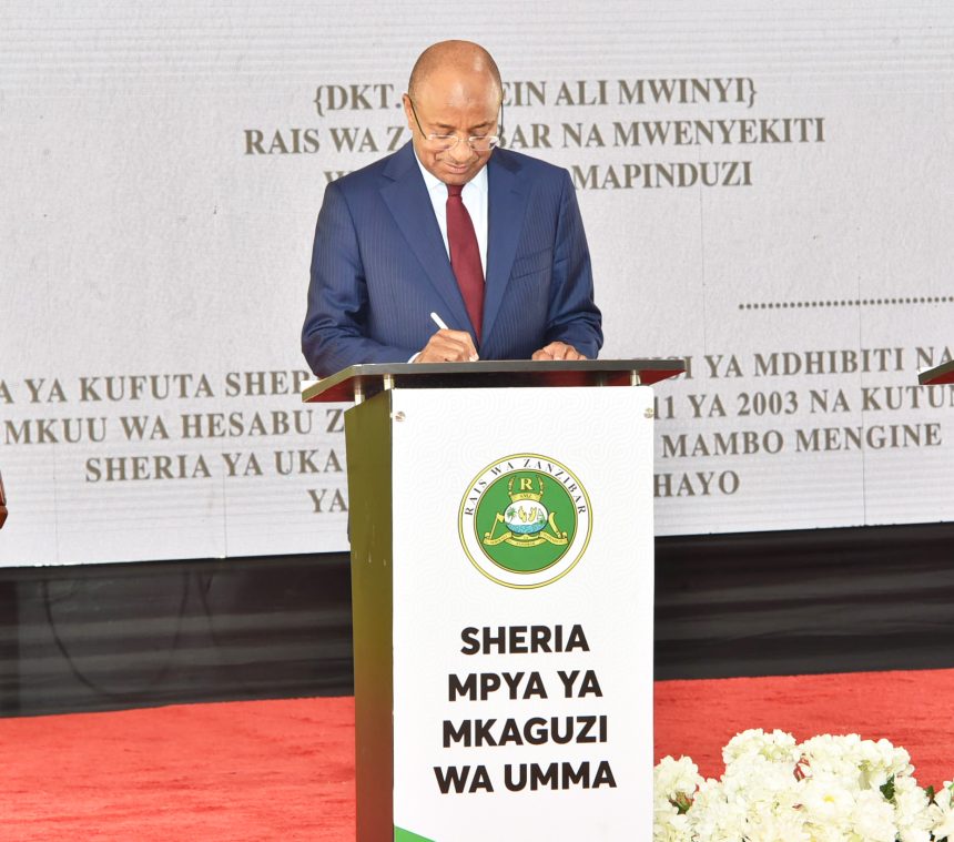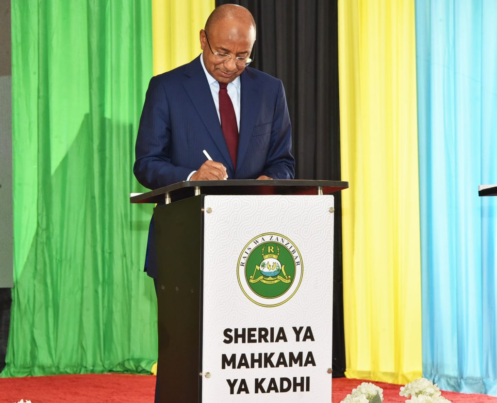 Rais wa Zanzibar na Mwenyekiti wa Baraza la Mapinduzi Mhe.Dk.Hussein Ali Mwinyi akitia saini Sheria ya Mahkama ya Kadhi,ambapo alitia saini Sheria mbali mbali za Serikali ya Mapinduzi Zanzibar, ikiwemo Sheria ya kuweka Masharti ya mtoaji wa Leseni,Sheria Mpya ya Uwekezaji Zanzibar,Sheria ya Mkaguzi wa Umma katika hafla iliyofanyika leo viwanja vya Ikulu Jijini Zanzibar .[Picha na Ikulu] 01/02/2024.