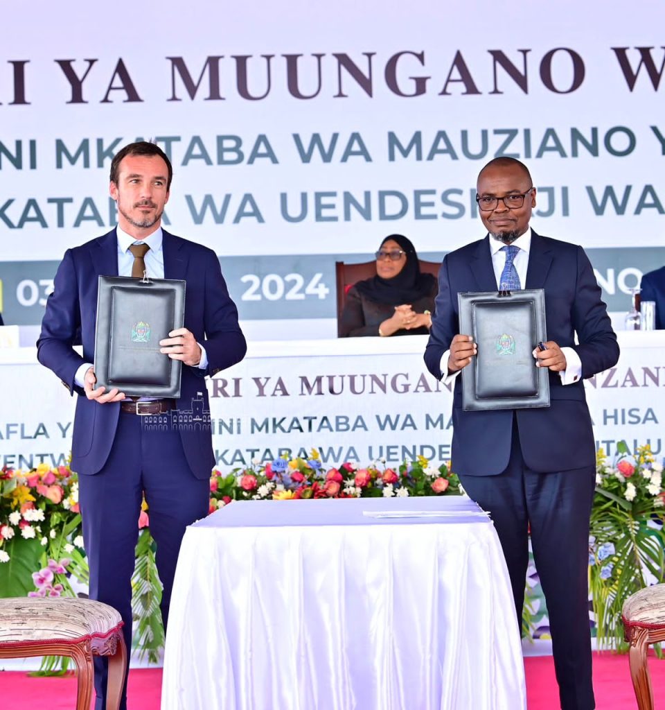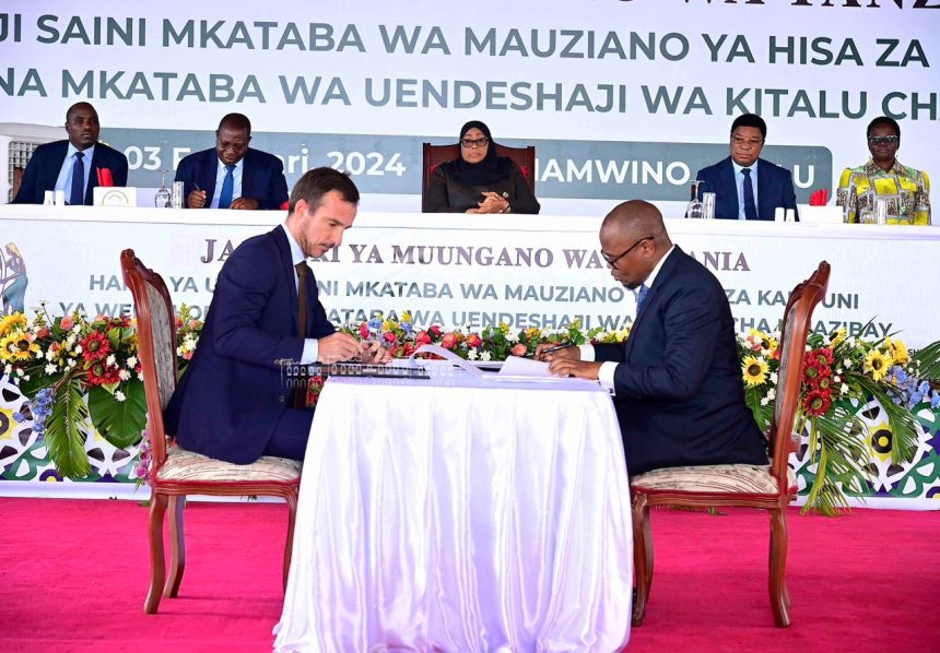 Mkurugenzi Mtendaji wa Shirika la Maendeleo ya Petroli Tanzania (TPDC) Mussa Makame (kulia) pamoja na Meneja Mkazi wa M & P Exploration Production Tanzania Limited Nicolas Engel (kushoto) wakisaini Mkataba wa Mauziano ya Hisa katika Kitalu cha uzalishaji wa Gesi Asilia cha Mnazibay baina ya Shirika la Maendeleo ya Petroli Tanzania (TPDC) pamoja na Kampuni ya M&P Exploration Production Tanzania Limited kwenye hafla iliyofanyika viwanja vya Ikulu Chamwino Mkoani Dodoma tarehe 03 Februari, 2024.