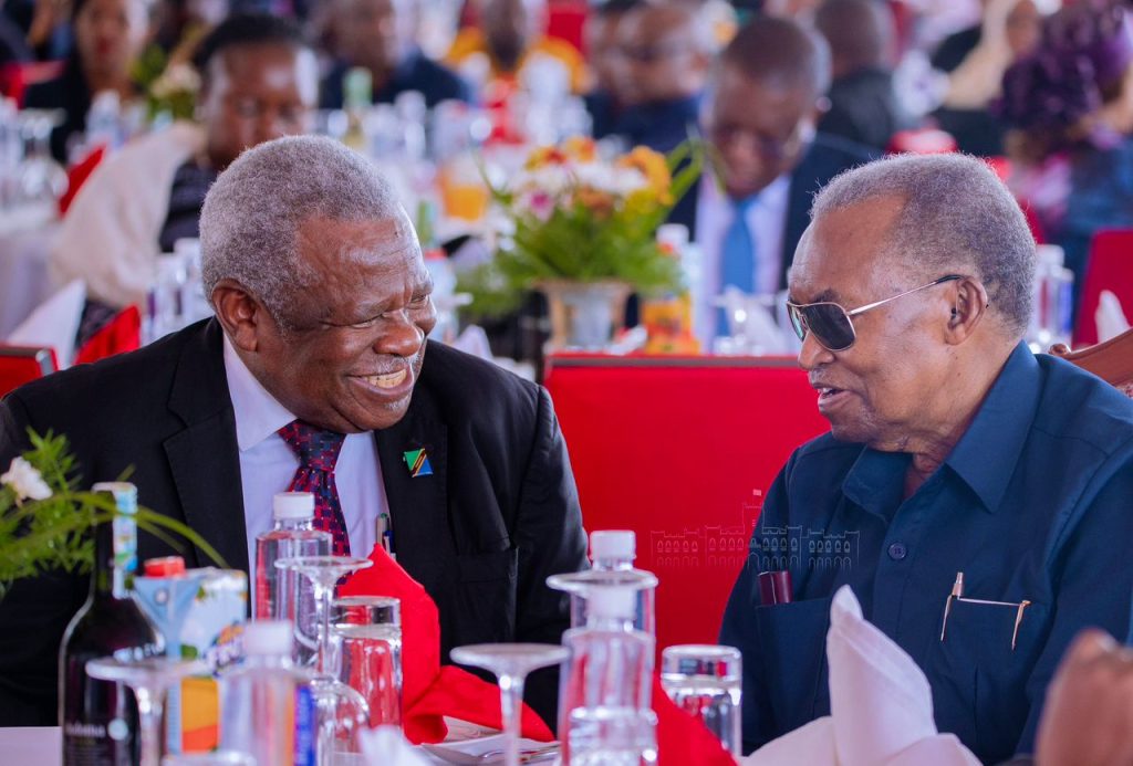 Waziri Mkuu Mstaafu Mhe. Cleopa David Msuya akizungumza jambo na Waziri wa Nchi, Ofisi ya Rais, Ikulu (Kazi Maalum) Mhe. George Huruma Mkuchika wakati wa hafla ya Utiaji Saini Mkataba wa Mauziano ya Hisa za Kampuni ya Wentworth Resources PLC katika Kitalu cha Mnazi Bay baina ya Shirika la Maendeleo ya Petroli Tanzania (TPDC) na Kampuni ya M&P, Ikulu Chamwino Mkoani Dodoma tarehe 03 Februari, 2024.